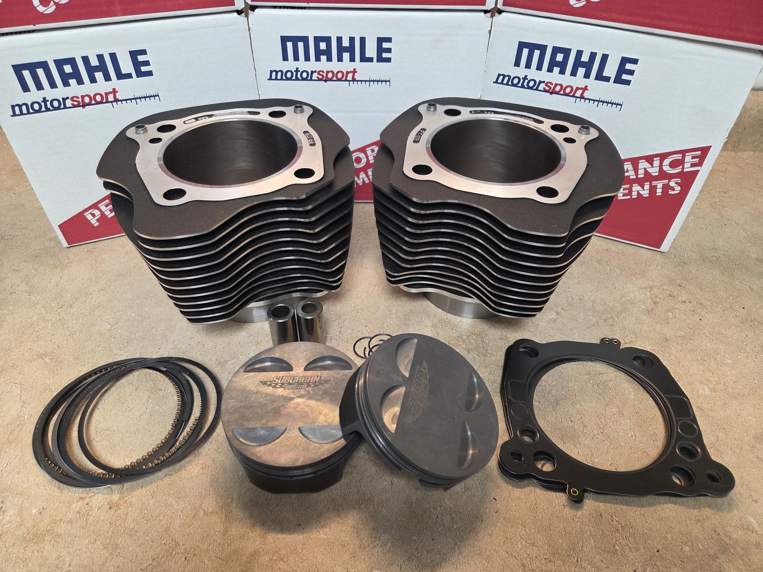 Suburban Speed and Mahle Motosports have come out with a 114 -117 TO 130 ci flat top piston & cylinder kit for your 2017+ Harley-Davidson® Milwaukee Eight. These pistons have a -1.2cc dome to get the compression up to 11.4 to 1 to 11.8 to 1 depending on the head gaskets. The same research and development has gone into these pistons as the rest of our pistons to give you the highest quality and reliability. This piston & cylinder kit does not require rebalancing flywheels like most of our competitors piston kits.